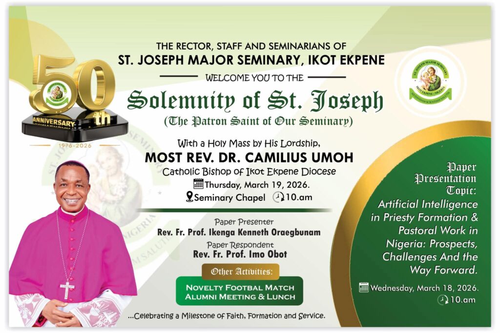Saint Joseph Major Seminary joyfully celebrated the Solemnity of Saint Joseph with a Eucharistic celebration presided over by the Catholic Bishop of Ikot Ekpene, Most. Rev. Dr. Camillus Umoh. The liturgy gathered formators, seminarians, clergy, and the lay faithful in a spirit of reverence and thanksgiving.